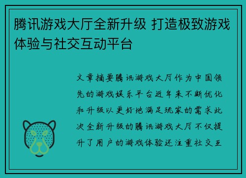 腾讯游戏大厅作为中国领先的游戏娱乐平台,近年来不断优化和升级,以更好地满足玩家的需求。此次全新升级的腾讯游戏大厅,不仅提升了用户的游戏体验,还注重社交互动的增强,使玩家可以在娱乐的同时享受到更加便捷和互动性强的社交体验。本文将从四个方面详细阐述腾讯游戏大厅全新升级的亮点与创新。首先,优化后的界面设计让玩家感受到更直观、更便捷的操作体验;其次,社交功能的提升让玩家之间的互动更为丰富,满足了个性化社交需求;第三,腾讯游戏大厅强化了云游戏的功能,提升了跨平台游戏体验;最后,腾讯对游戏大厅的智能化管理也进行了一系列创新,极大地提高了平台的稳定性和安全性。通过这四个方面的创新,腾讯游戏大厅致力于打造一个极致的游戏体验与社交互动平台,让玩家无论在游戏中还是社交互动中都能享受到前所未有的乐趣与便利。